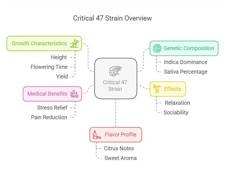 Critical 47 strain stands out due to its balanced genetic profile, combining a strong, relaxing effect with a happy, talkative experience. Its aromatic, resinous buds deliver refreshing citrus and sweet flavors that help relieve fatigue, muscle spasms, and stress.