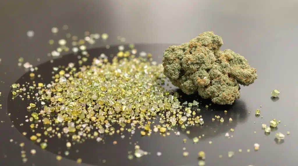 Crystalline diamonds are another prominent form of cannabis concentrate, crafted to achieve an extremely high degree of purity by isolating either THC or THCA. These diamonds are known for their sparkling, gem-like appearance, which signals their purity and concentrated form. Crystalline diamonds usually lack additional terpenes or plant compounds, delivering an experience focused on THC or THCA without the complexities of a full-spectrum profile. For users who prioritize purity and potency, crystalline diamonds are a top choice.