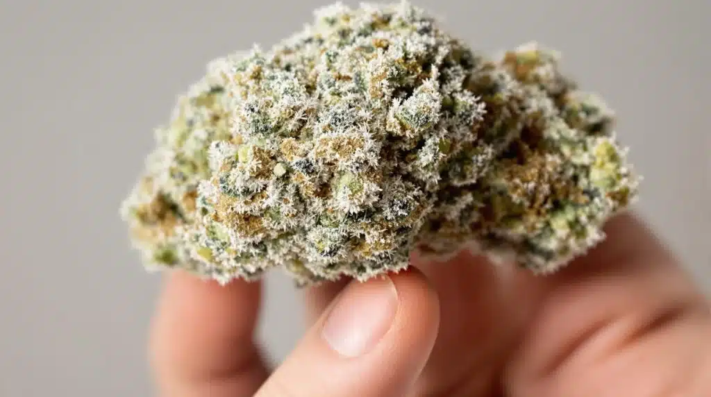 THC crystals appear as tiny, frosty, crystal-like structures covering the buds, giving them a sparkling appearance. They may look white or amber, depending on the strain and maturity level. This frosty coating is often a sign of high potency, as it indicates a rich presence of cannabinoids and terpenes.